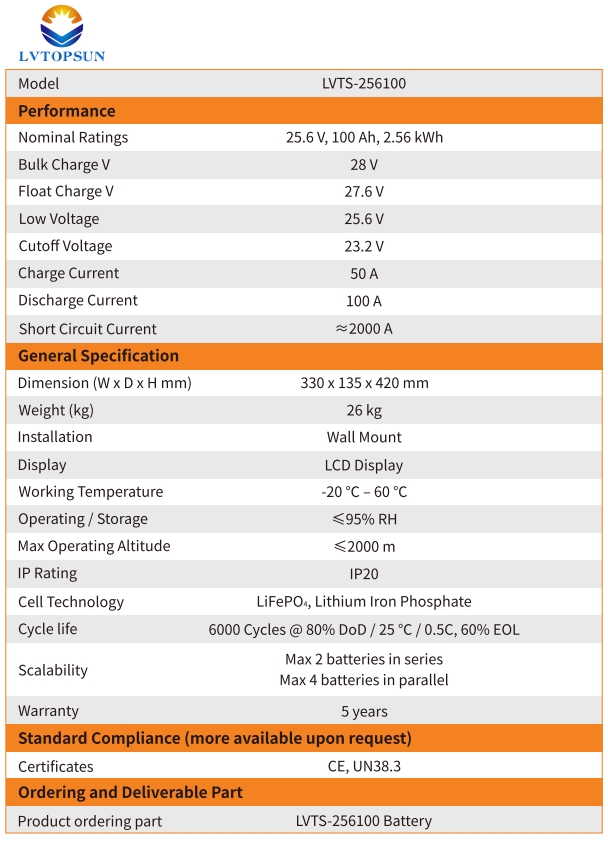 Pin lưu trữ lithium LVTOPSUN 25.6V-100Ah (LVTS-256100)